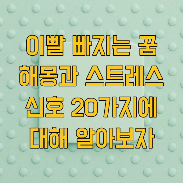 그래서 오늘은 이빨 빠지는 꿈 해몽 과 함께, 우리 몸이 보내는 스트레스 신호 20가지 에 대해 자세히 알아보려 합니다. 꿈이 단순한 심리 현상인지, 아니면 숨겨진 메시지를 담고 있는지 함께 파헤쳐 보고 , 스트레스에 효과적으로 대처하는 방법까지 꼼꼼하게 짚어볼게요. 혹시 지금 마음이 불안하거나 답답하신 분들이 있다면, 이 글이 조금이나마 위로와 도움이 되기를 바랍니다.