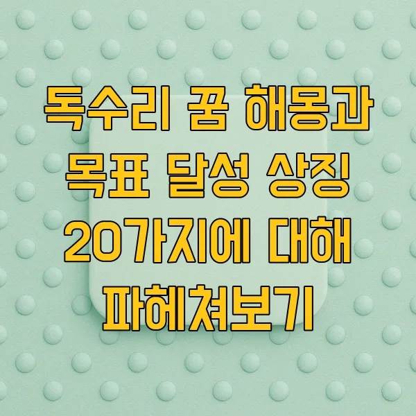 이번 글에서는 독수리 꿈 해몽 과 더불어, 목표 달성 상징 20가지에 대해 자세히 파헤쳐 보겠습니다. 꿈속 독수리 가 우리에게 던지는 메시지는 과연 무엇일까요? 함께 그 의미를 탐색하며, 꿈이 현실로 이어지는 놀라운 여정 을 시작해 봅시다.